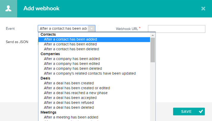 • Teamleader: allows to subscribe to all events on their available CRM entities.  You can choose between JSON or XML format.