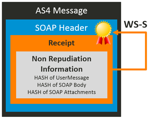 AS4 provides legal proof for this non-repudiation of receipt, by applying the WS-Security signing feature on Receipts. The exchanged Receipts are signed by the receiving MSH, which authenticates the originator of the receipt. The signature of Receipts must be applied on the ebMS Messaging Header.