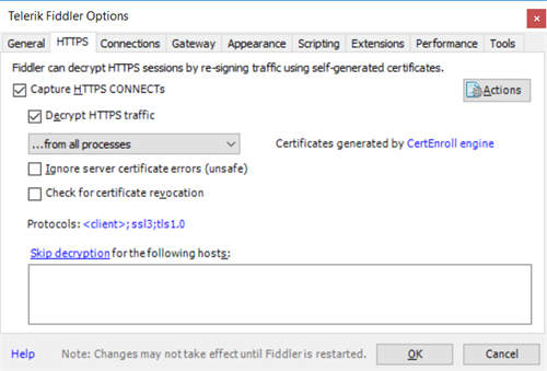 • Ensure you configure Fiddler to Decrypt HTTPS traffic.