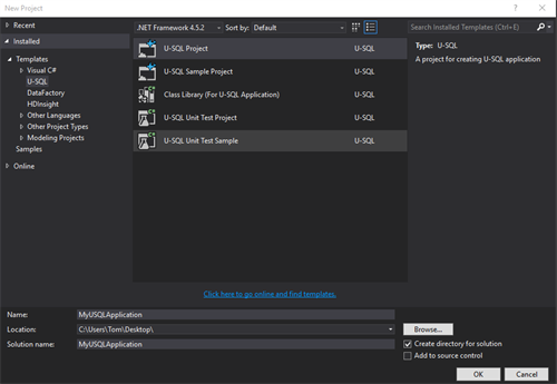 With the Azure Data Lake Tools for Visual Studio you create a solution/project for U-SQL based on these templates: