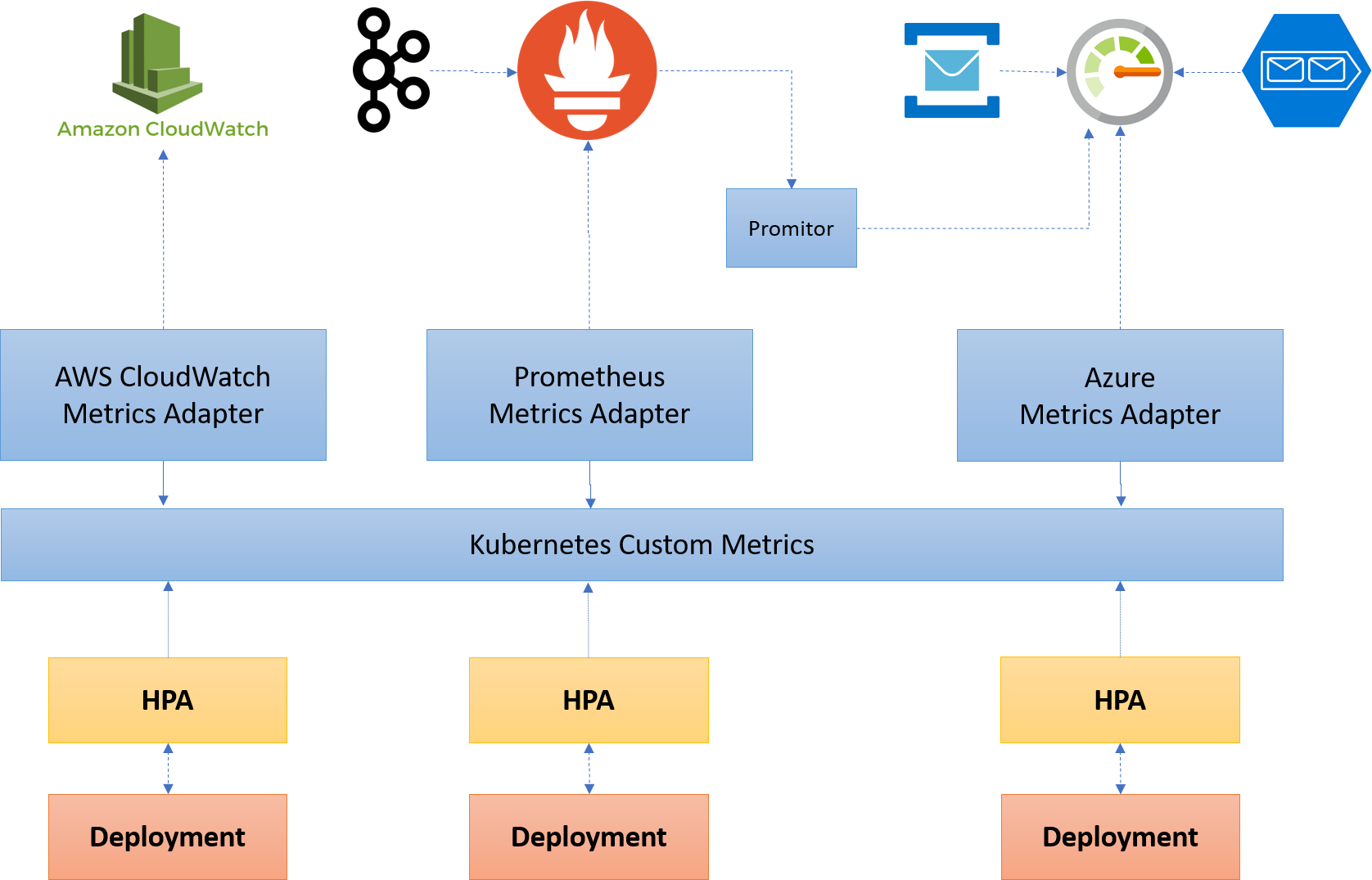 Without KEDA, it is up to you to define how your deployments have to scale by creating Horizontal Pod Autoscalers (HPA). But before you can do that, you need to run a metric adapter to pull the metrics from the source that you want.