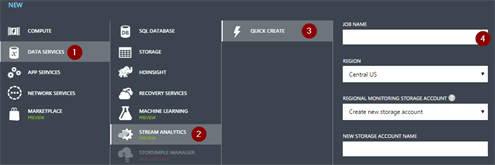 Log on to the Azure portal and click the ASA icon. There, you can create a new job. The job has to have a name, a region and a monitoring account. (there is one monitoring account for every region).