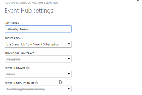 Create a new input and define the input as Data Stream (constant inflow of data). Select Event Hub in the second window of the wizard, as that’s the input we want to work with. In the 3rd part of the wizard, we have to select the event hub we are sending our events to. Ideally this is in the same subscription.