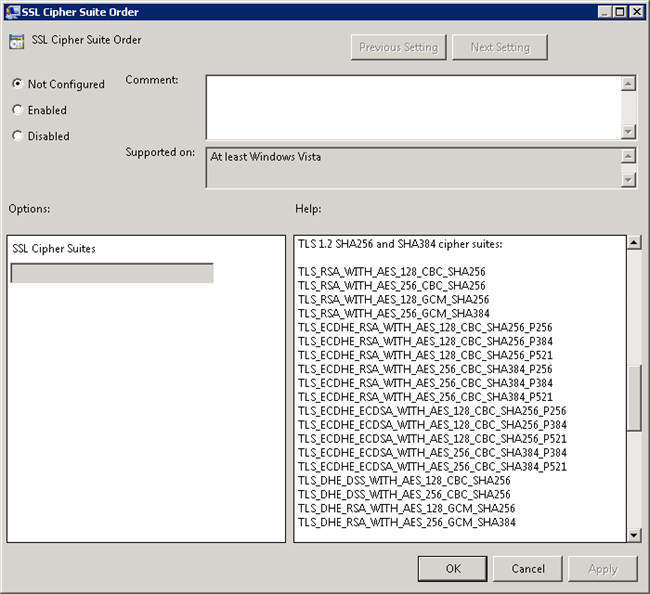 This editor can be opened by typing “gpedit.msc” in de “Run”-dialogue. Once the editor has popped up, navigate down towards the “SSL Configuration Settings”, to find the “SSL Cipher Suite Order”-property.
