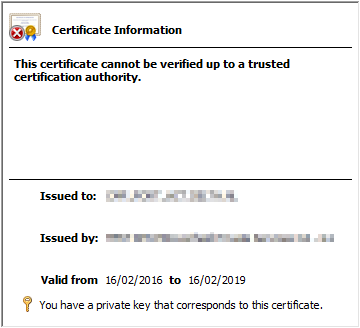 One possible way to check if these have been imported correctly is to open up the properties of the signing certificate (the one with the private key, that should be in the ‘Personal’-store) and verify if there is not an error-symbol showing as in the screenshot below. If this seems OK, good chances are, the certificates are in the correct store.