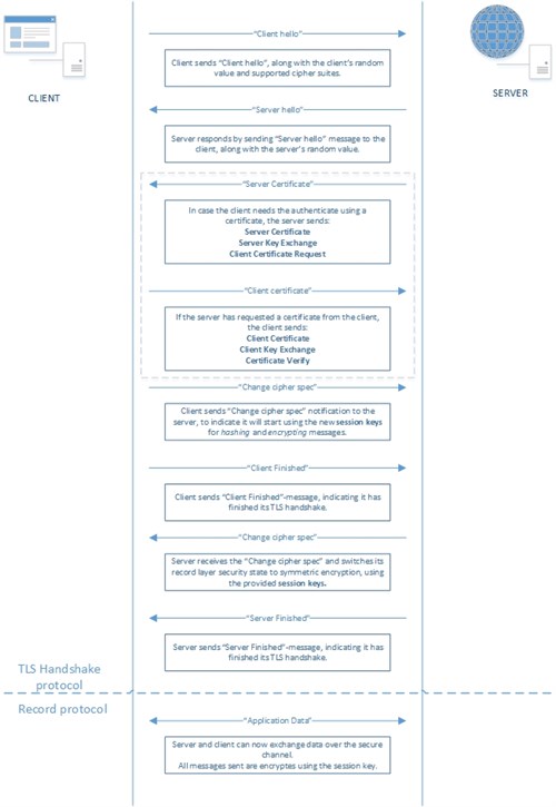 Perhaps before diving into the exception handling, it might come in handy to get a little overview of the TLS handshake protocol that is being used to set up the secure channel in between the client and server. Therefore a schema can be found below, which explains what steps are being performed by both client and server.