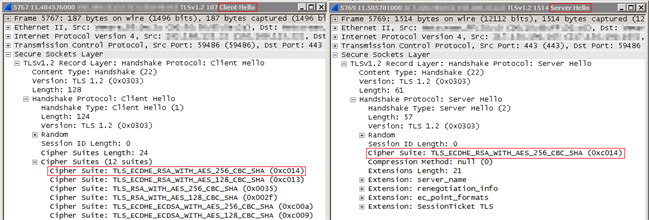 Looking at the Wireshark-trace, we got to see the complete process of the working connection, as well as the correct cipher suites when drilling down into the details.