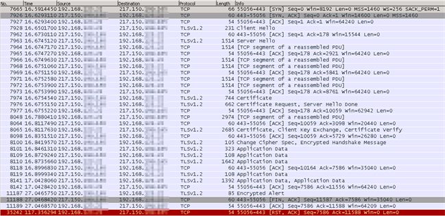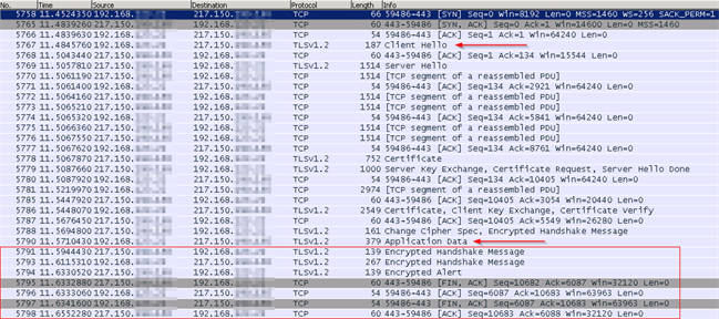 While using Wireshark to troubleshoot the connectivity issues, we noticed that the actual negotiation in between client and server went OK and BizTalk Server was actually using TLS 1.2. However, when the actual data-transmission was supposed to start, the handshake was failing and an ‘Encrypted Alert’ was returned by the server, which was followed by the closing down of the connection.