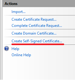- Click in Actions pane on “Create Self-Signed Certificate”