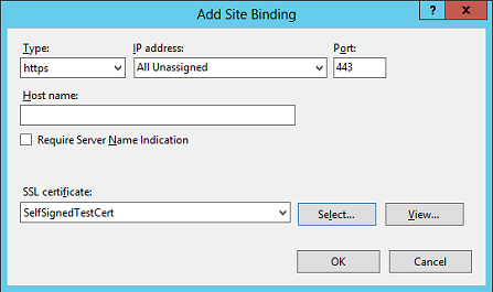 - Add an https Binding and select the Certificate you just generated with IIS and click “OK”