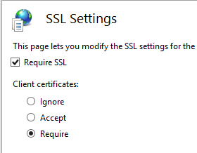 - Check “Require SSL” and select Require for Client certificates, this way we require the user to present his certificate in order to access the webservice.