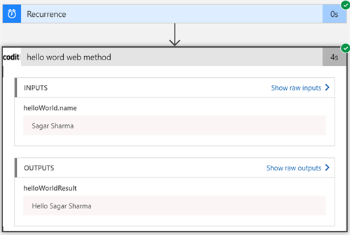 • Click on save and then run it. Within a moment you should see response from your on-premise web service based on your input parameter