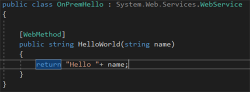 • Write some web method. Again, I am doing it in easiest way so, for example “HelloWorld” with one parameter: