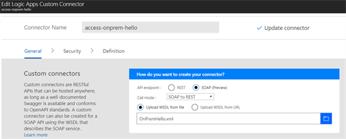 • Open a custom connector and click on edit. Choose API Endpoint as SOAP and Call mode as SOAP to REST and then browse to upload WSDL file of your on-premise webservice.