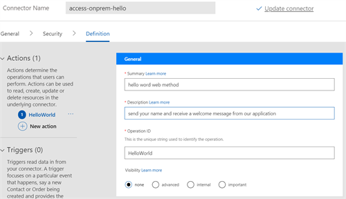 • In the definition tab, fill some summary and description. Keep default value of rest of the configuration and click on “Update connecter” from top right of the screen.