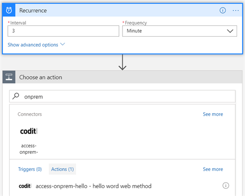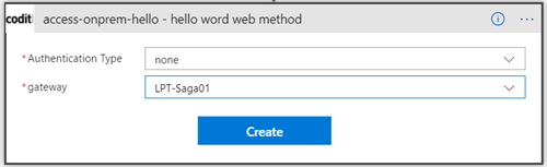 • Choose your web method as action. Then choose your on-premise gateway which you want to use to connect with your on-premise web service and click on create