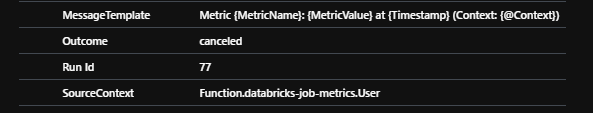 Metric Databricks Job Completed: 1 at 12/10/2020 08:50:01 +00:00 (Context: [Run Id, 77], [Job Id, 9], [Job Name, My Databricks Job], [Outcome, success])