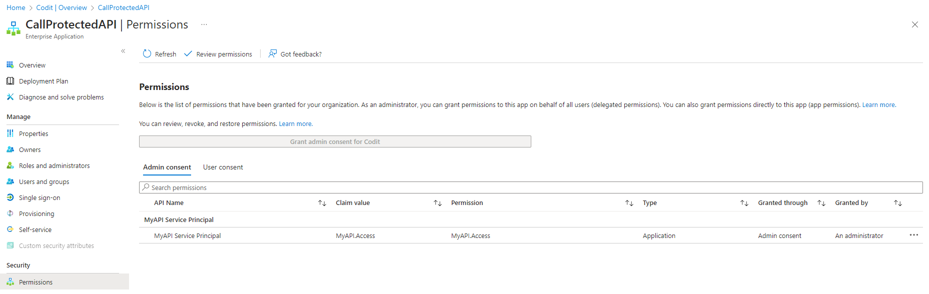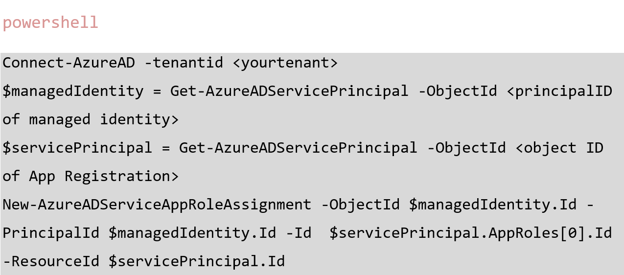 Now you must grant this role to the managed identities able to access this API. This is the quirky part: the portal will not allow you to assign a service principal to a managed identity, so you must do this with PowerShell as follows: