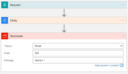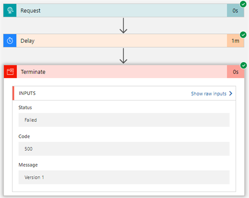 • I created a long running Logic App with a delay of 1 minute and a terminate with Version 1 as the message.