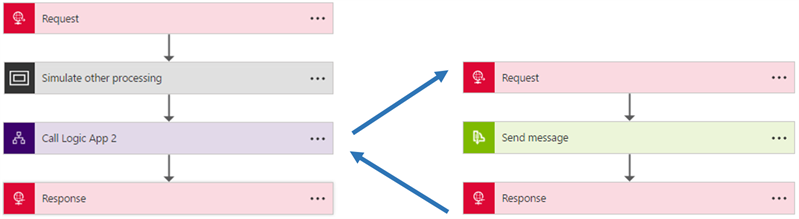 As a starting point, I create Logic App 1 that is exposed as a web service and which invokes Logic App 2 in a synchronous way. The second Logic App just puts a request on a Service Bus queue. Once that action is completed, a response is returned and the first Logic App can return a success to the consuming application.