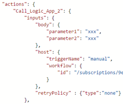 Because I want to avoid timeouts because of automatic retries, I update the Call Logic App 2 action, so it will not perform a retry. This is done in the code view. Depending on your use case, you could also limit the number of retries. The minimal time interval between retries is 20 seconds, which is also the default value. This is quite high for a web service scenario, as most clients time out after 60 seconds.