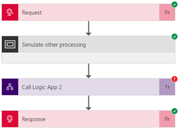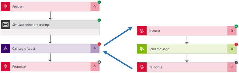To see what happens in case of an exception, I reconfigure Logic App 2 to send to a non-existing queue. In both Logic Apps, the Response action is skipped because the Logic App stops processing in case of a failure.