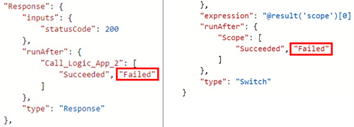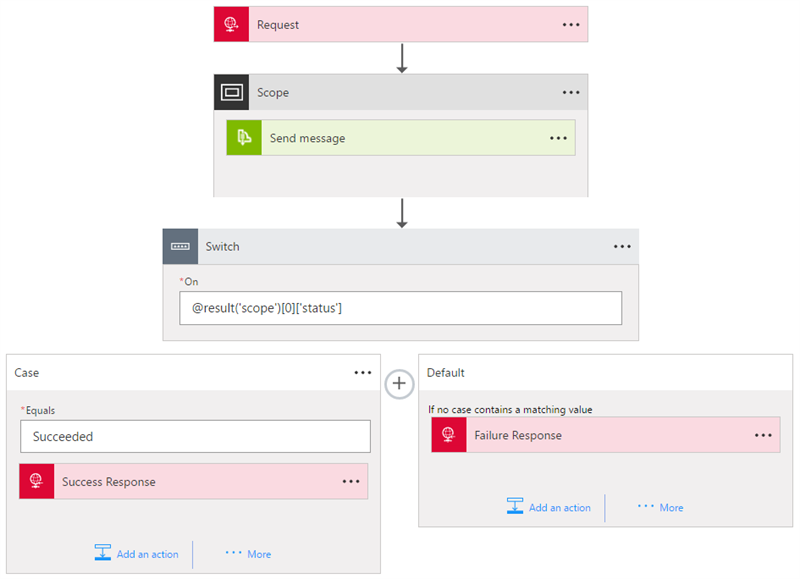 Remark the Switch statement, based on the status of the scope. The @result function returns an array, that provides a result for each action within the scope. The status of the first action is extracted via this expression: @result(‘scope’)[0][‘status’].