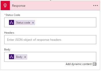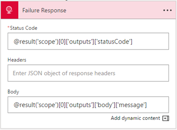 In the Failure Response, I return the resulting status code – @result(‘scope’)[0][‘outputs’][‘statusCode’] – and exception message – @result(‘scope’)[0][‘outputs’][‘body’][‘message’].