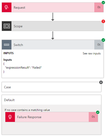 If we trigger an exception scenario, the run detail of Logic App 2 looks good. The Scope has failed, which is detected by the Switch statement and the Logic App returns the Failure Response.