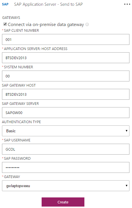 Fill in all necessary connection options to your SAP Server. Please take note that here we are using the on premises data gateway to connect to the gateway machine.