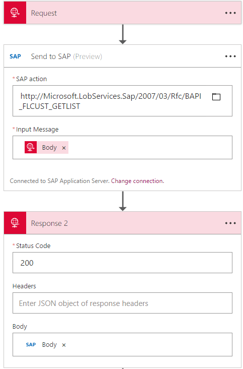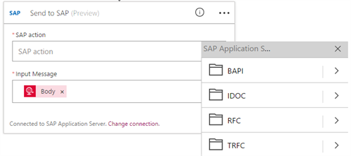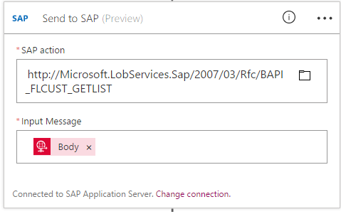 It’s also perfectly possible to manually add this action to the Logic App Connector. In the case below the action was added manually. As an input message we are passing the Request Body to the SAP Server.