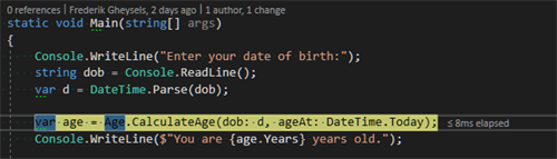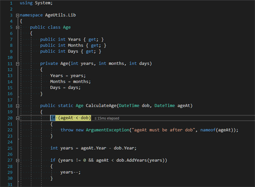 As an example, I have a little program called AgeCalculator that uses a simple NuGet package AgeUtils.Lib for which I have exposed its symbols: