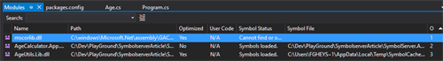 While debugging the program, you can see in the Modules window of Visual Studio that symbols for the external dll AgeUtils.Lib have been loaded. This means that Visual Studio has found the pdb file that matches the version of the AgeUtils.Lib assembly that is currently in use.