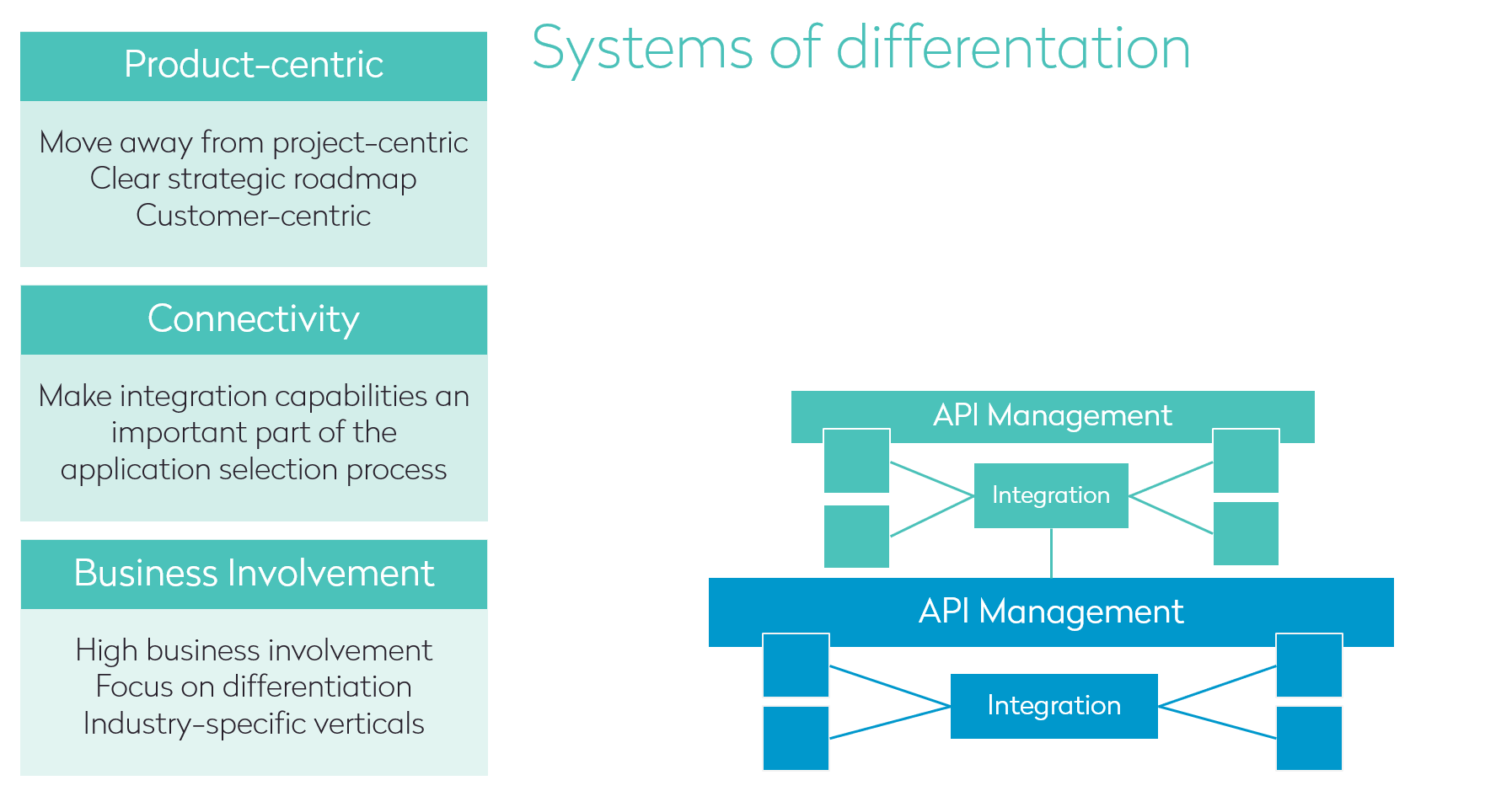 - Maintain a solid and secure foundation – Any integrations, APIs, or applications built on this layer must be well-defined, solid, and thoroughly validated for data and security. Otherwise, the whole organization will be negatively impacted.