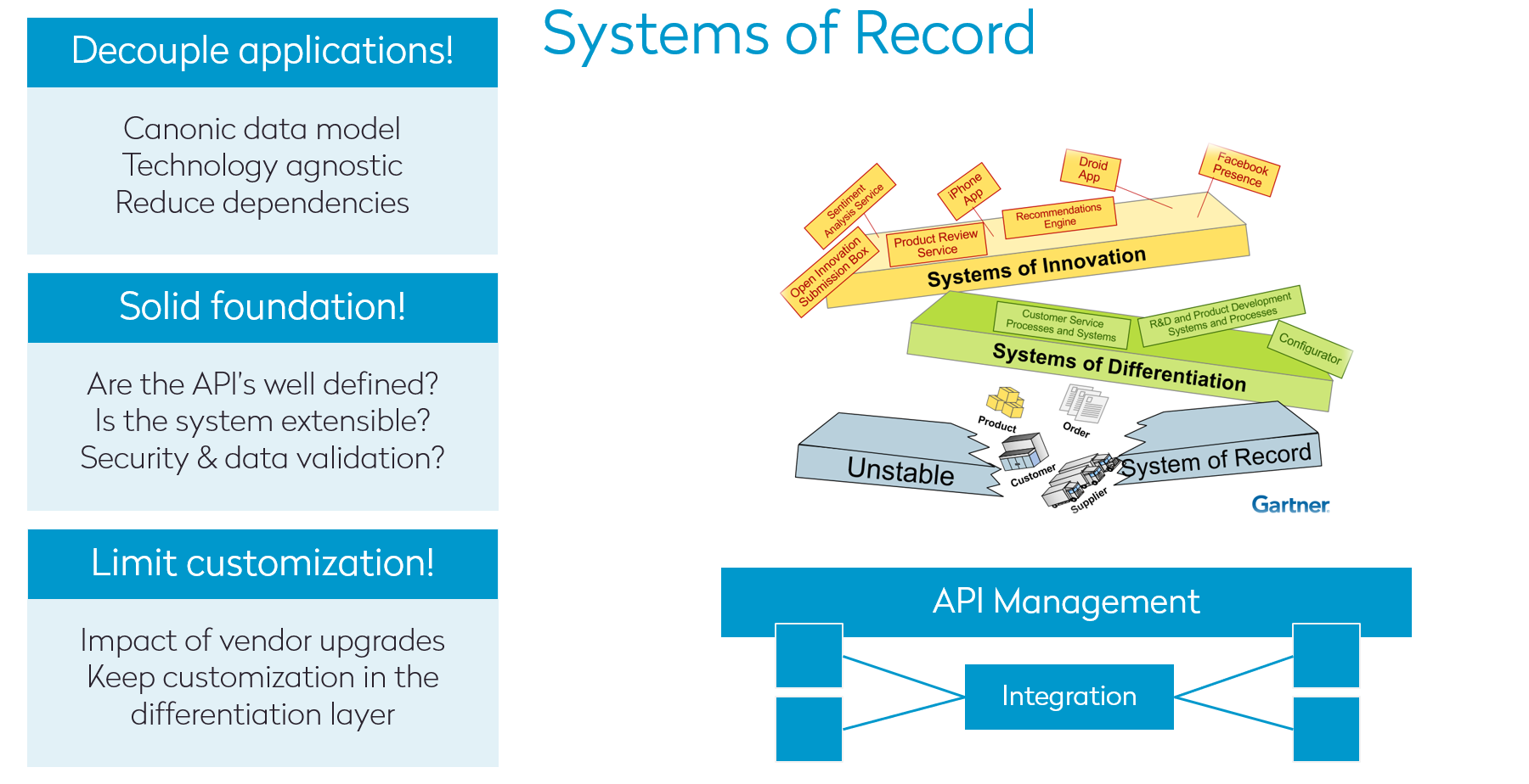 - Limit customization – Customizing systems on this layer threatens a company’s ability to upgrade those systems in the future. As such, modifications to record systems should be limited as much as possible and left for those on the differentiation layer.