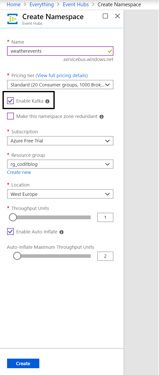 Kafka is available in the standard and dedicated tier of Azure Event Hubs. By provisioning an instance (namespace) of Event Hubs, you can enable the Kafka capability. Moreover, by allowing Kafka, you will enable your Event Hubs Namespace to understand Apache Kafka’s message protocol and APIs natively.