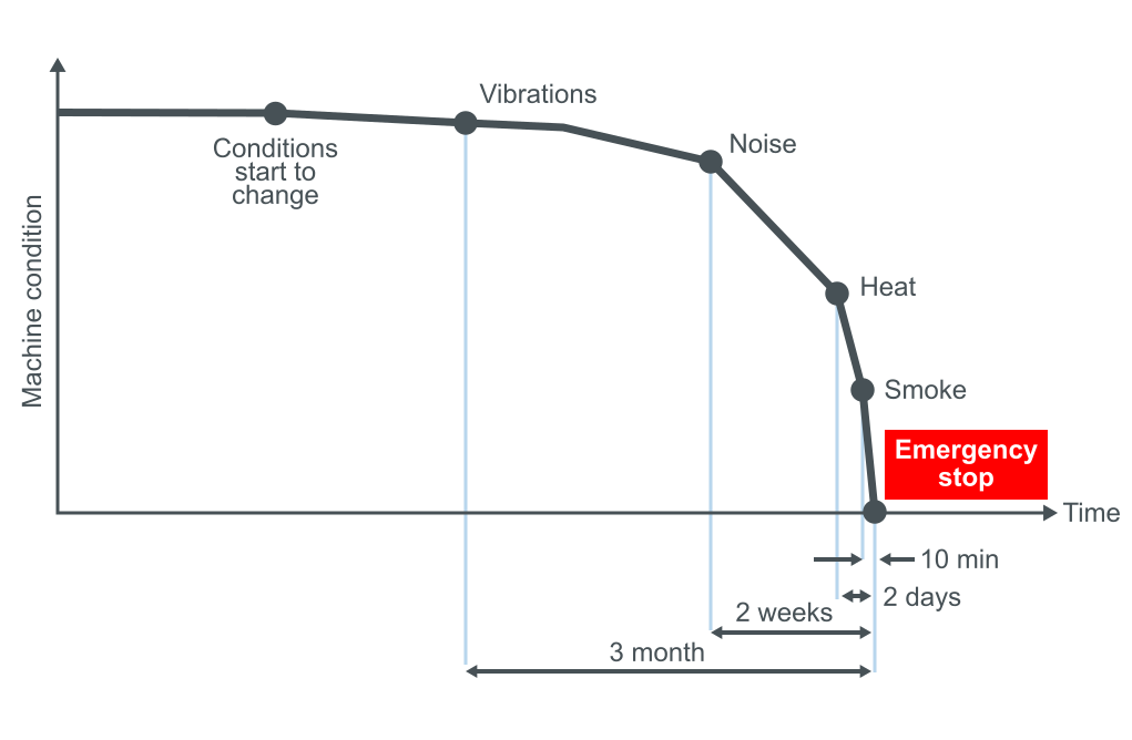 The deterioration of equipment condition over time, up to the point of failure, is clearly shown in