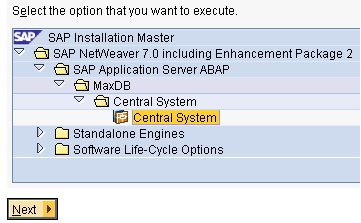 The option we will install is the MaxDB – Central System. Select this option and choose next to continue.