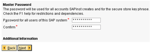 Choose the Master Password in the next window. This password will be used for all the accounts that SAP will use, so choose wisely!