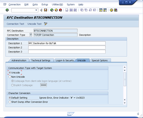 Provide a name for the RFC Destination (BTSCONNECTION) and give it an appropriate description.