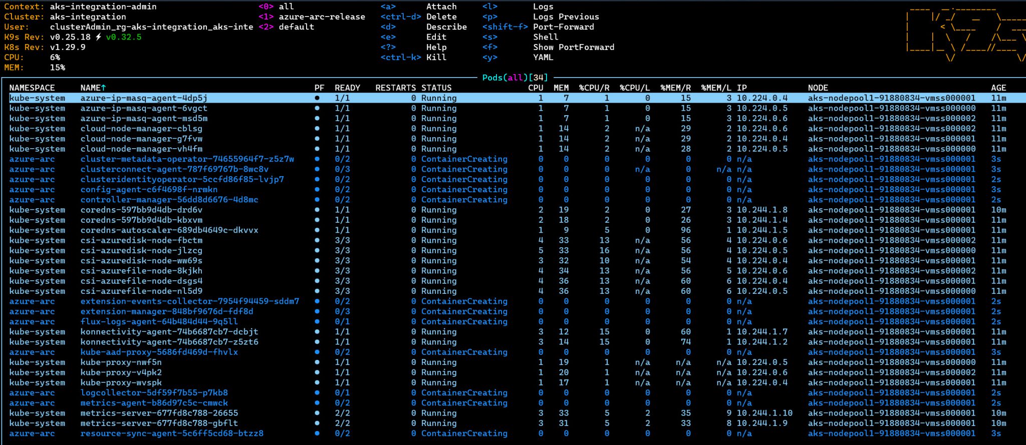 - Make the AKS cluster arc-enabled (a set of components are created in the azure-arc namespace)
