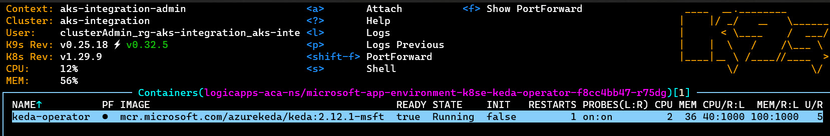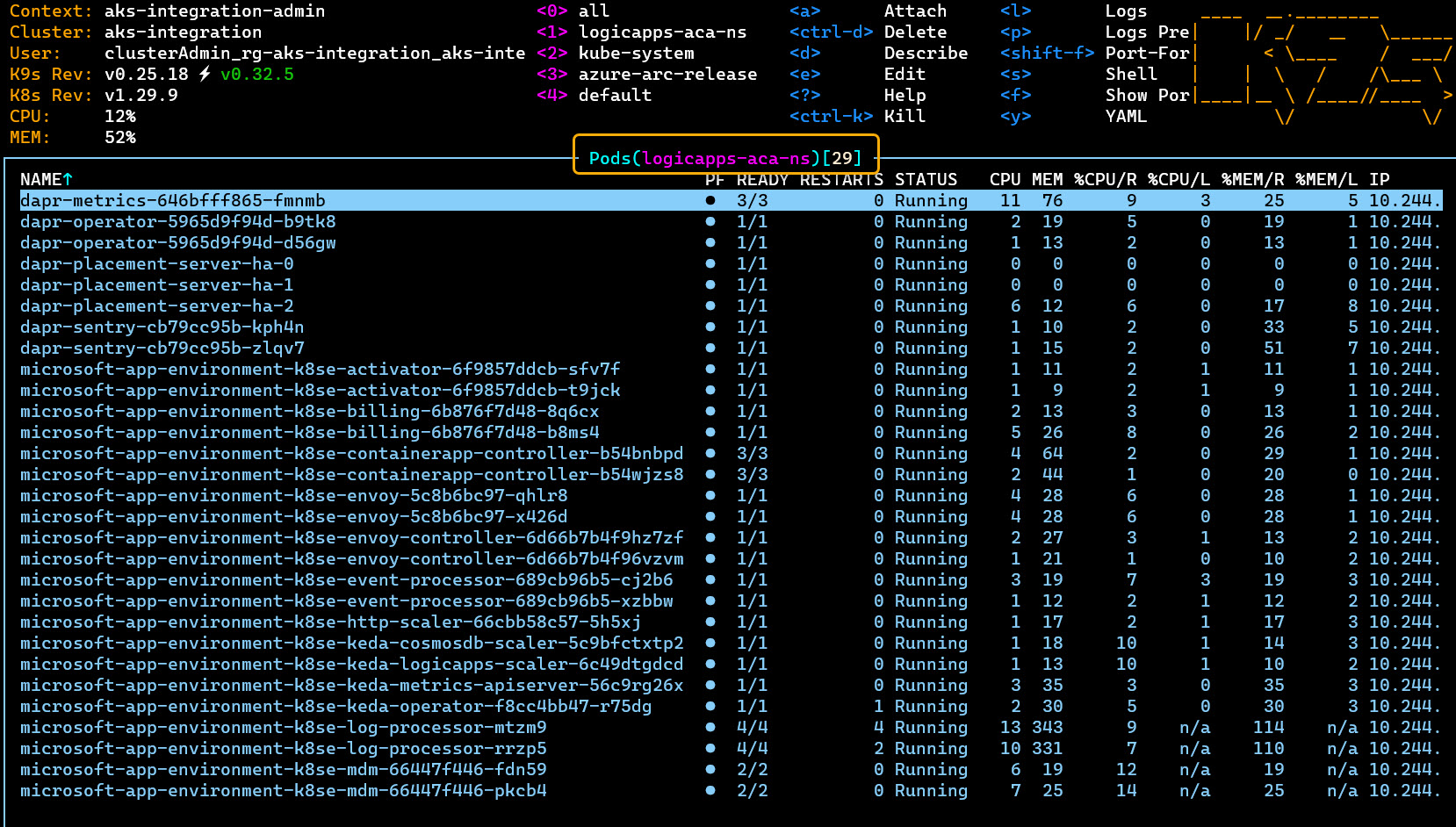 - Install the container apps extension. The following pods will be created in the namespace passed to the “az k8s-extension create” command. In my case the Azure Container Apps runtime has been created in the “logicapps-aca-ns” namespace, the installation took approximately 35 minutes to complete.