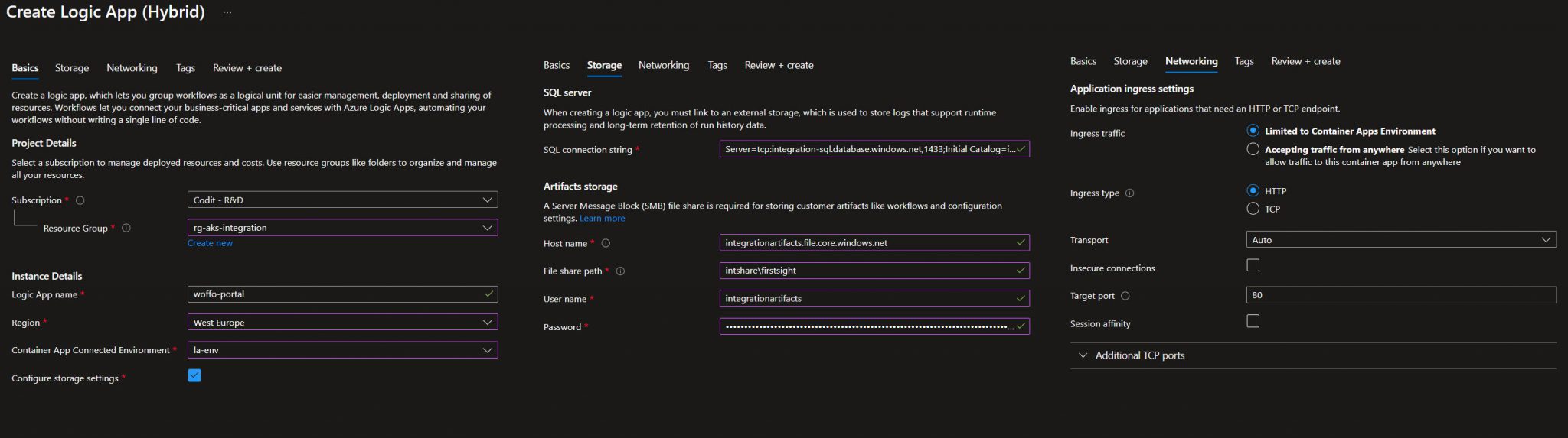 As a part of the ‘basic’ information it’s important to specify the ACA environment to be used which represents the K8S namespace where the Logic App pod will be created. While the Arc location technically represents a namespace, since only one ACA environment can be defined per location, we can view the ACA environment as equivalent (twin) to a Kubernetes namespace. As a second step we configured the connections to the external storages (SQL and SMB share) and as a final step we specify that we want to keep our logic apps private meaning we do not want to expose our workflows outside the Kubernetes cluster.
