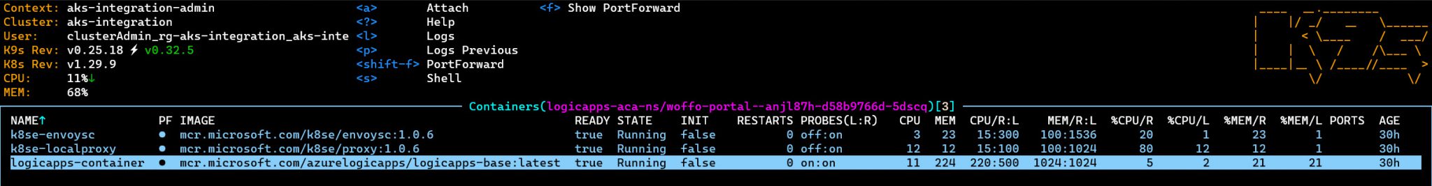 Once deployment is complete, the Arc magic happens, and our Logic App pod (woffo-portal–anjl87h-d58b9766d-5dscq) appears in the cluster. Need to adjust the pod configuration (such as scaling or resiliency)? Simply define the desired state in Azure, and the configuration will be automatically fetched and applied to the AKS cluster.