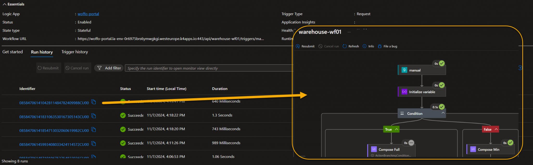We can now go to the Azure Portal, select our Logic App, and view the run history along with detailed workflow run information. These details are stored in a SQL database (cloud, on-premises, or edge) and are retrieved by the Azure Portal through polling a public endpoint exposed by the Azure Container Apps extension.
