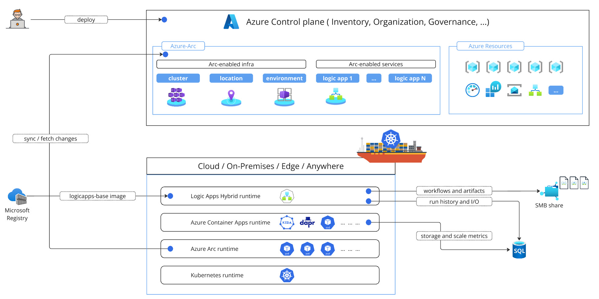 The following image provides a high-level overview of the Logic Apps hybrid architecture. Note that this is a partially connected setup, as your remote Kubernetes cluster must maintain an outbound connection to the Azure control plane to fetch configuration changes, receive new deployments, and propagate logs, billing information, and more.