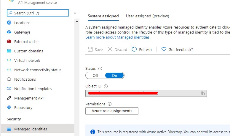 - Go to Azure API Management and enable Managed Identity by turning the status toggle to ‘On’.