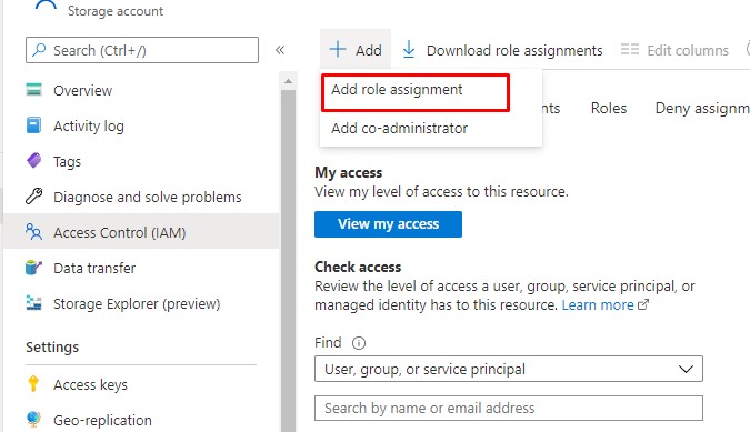 - Go to the storage account where you want to manage your mocks and add a Role assignment