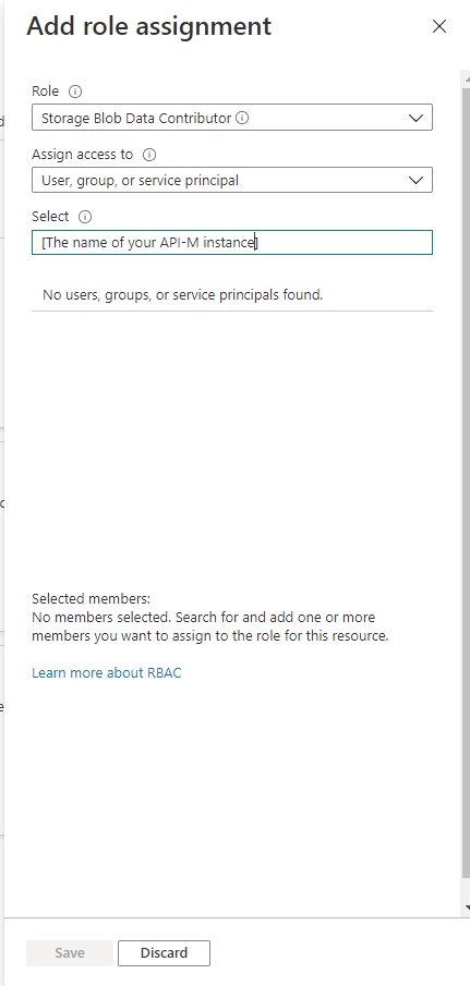 - On the role assignment page select as role ‘Storage Blob Data Contributor’ and select the name of your API-M instance. Confirm by pressing on Save.