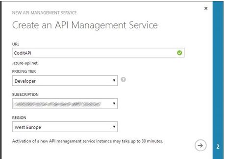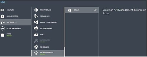 The API management service can be easily provisioned in the Azure portal by choosing App Service / API Management / Create